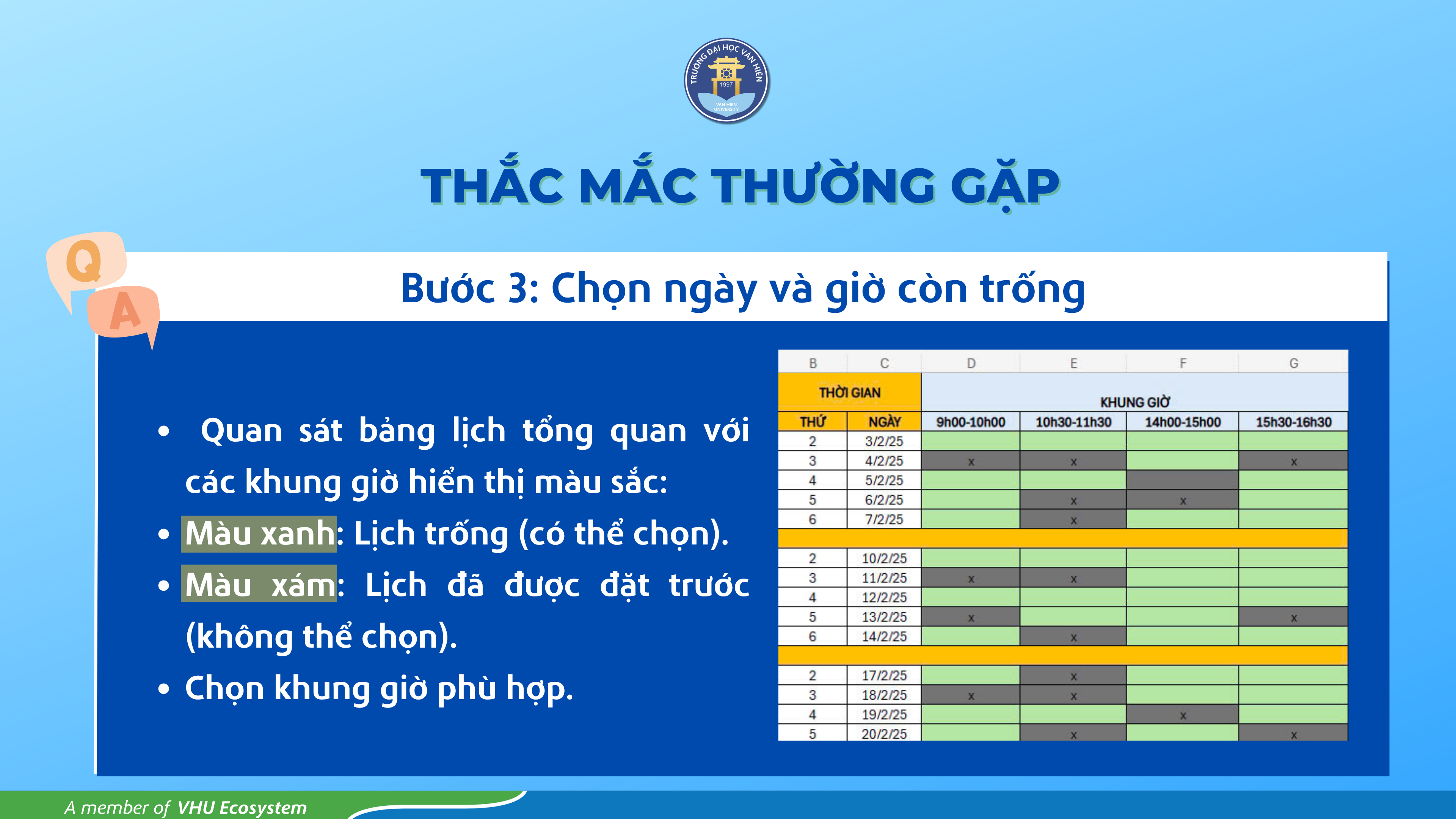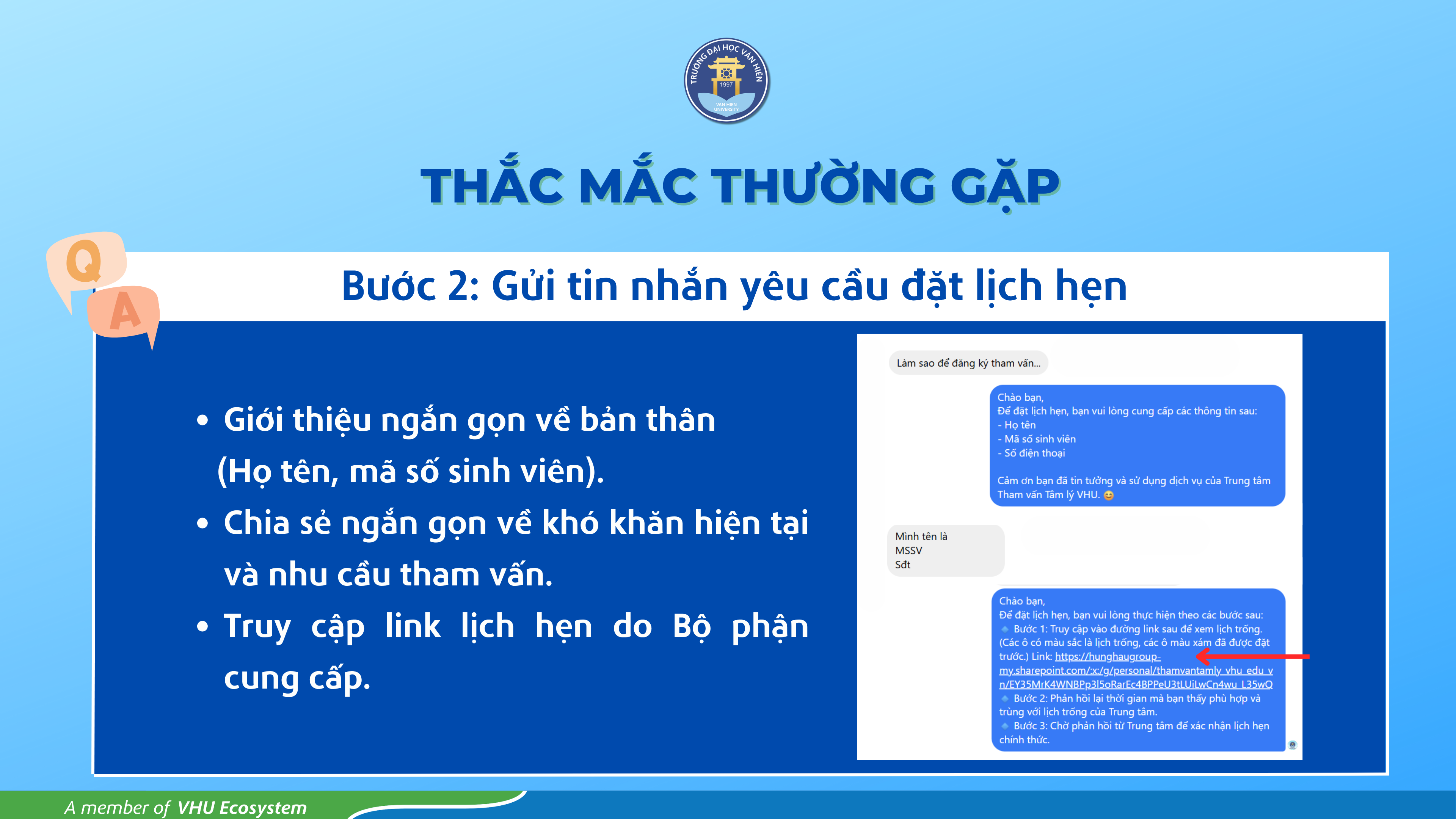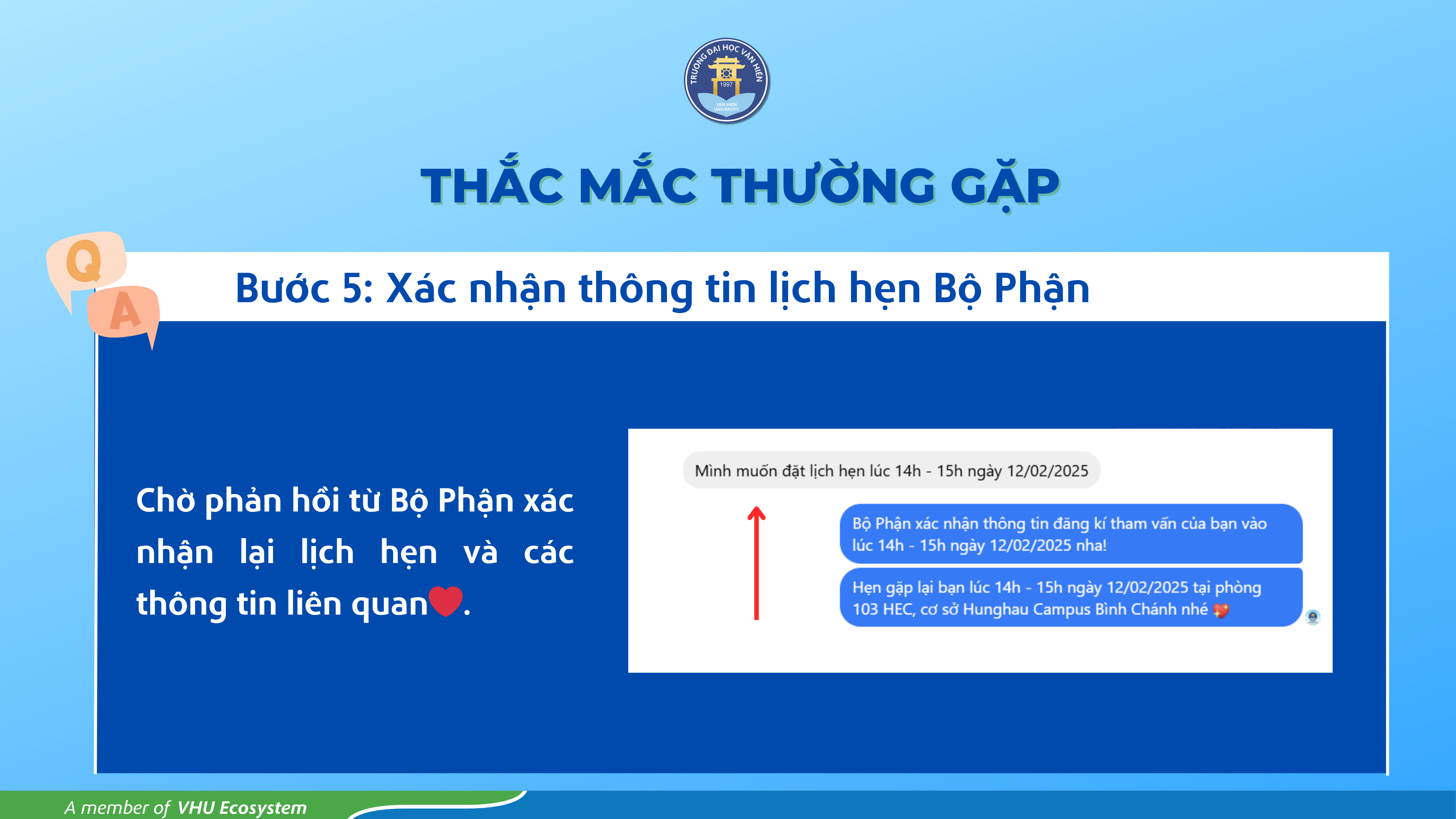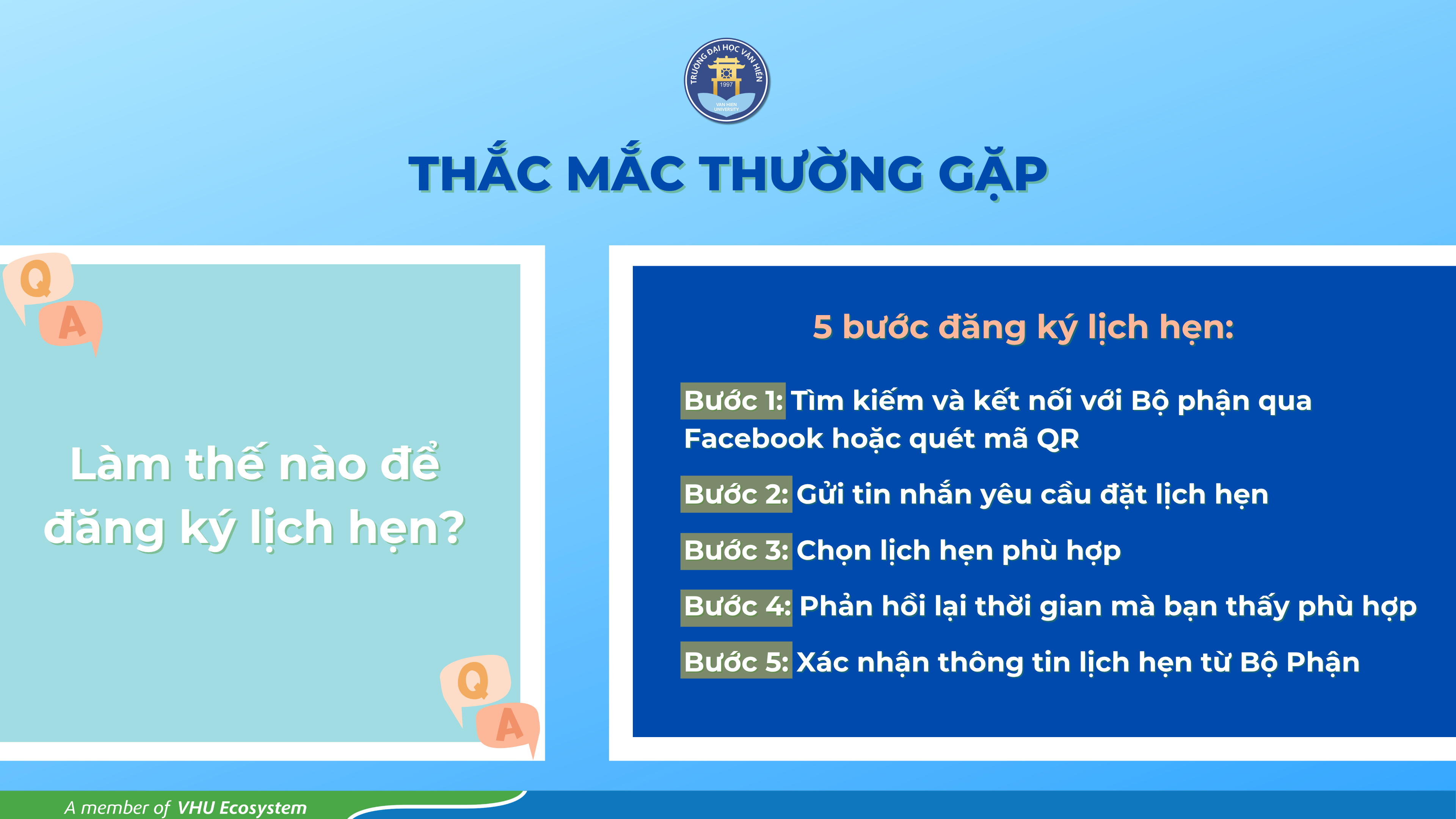 Dịch vụ tham vấn tại đây hoàn toàn miễn phí và dành riêng cho sinh viên VHU. Để đăng ký buổi tham vấn, sinh viên chỉ cần thực hiện theo 5 bước đơn giản sau: