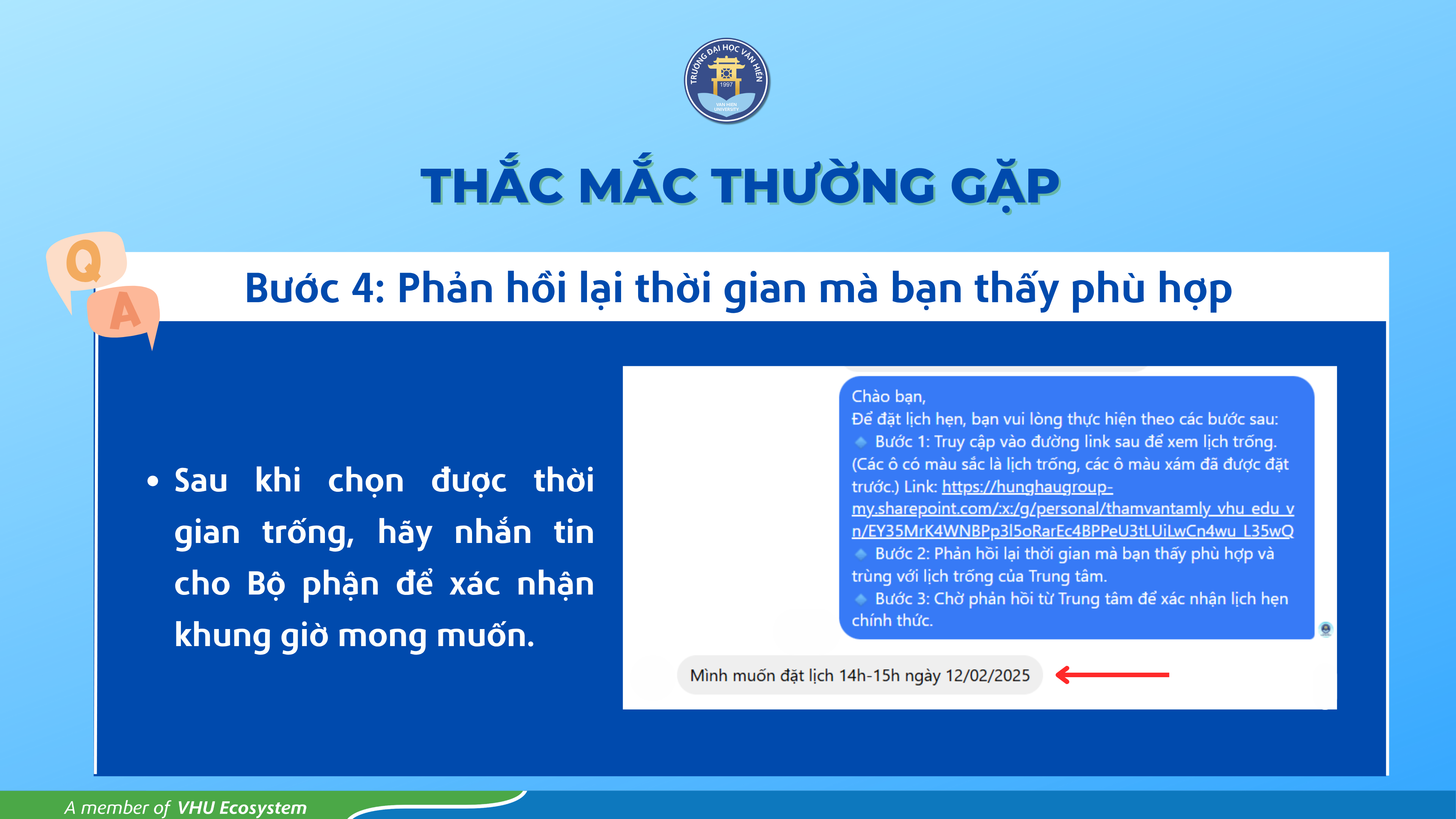 Sau khi chọn được thời gian trống, hãy nhắn tin cho Bộ phận để xác nhận khung giờ mong muốn.